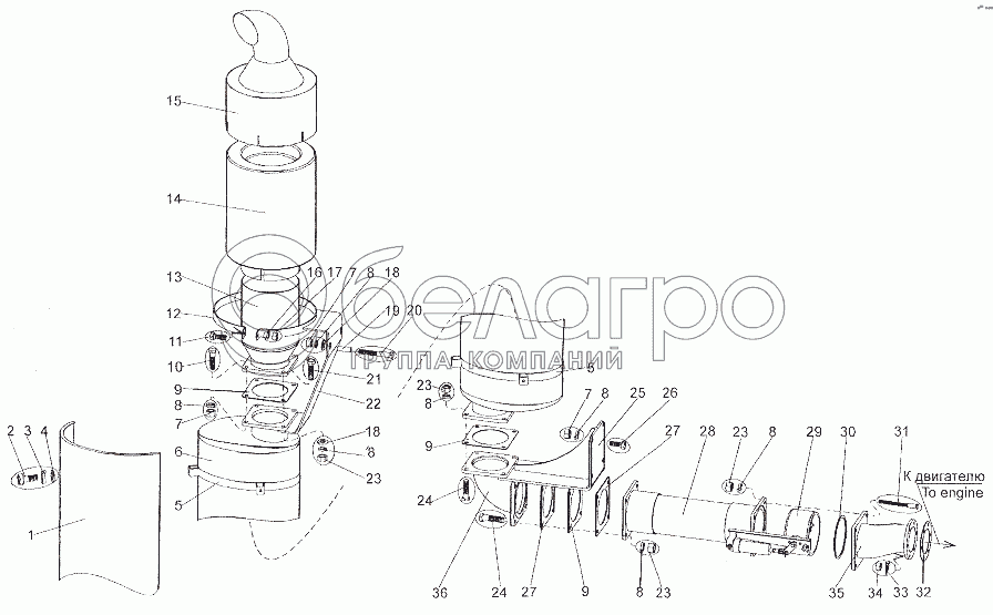 Каталог запасных частей к технике: МЗКТ-7402. Установка системы выпуска отработавших газов