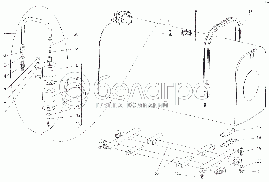 Каталог запасных частей к технике: МЗКТ-7402. Установка верхнего топливного бака