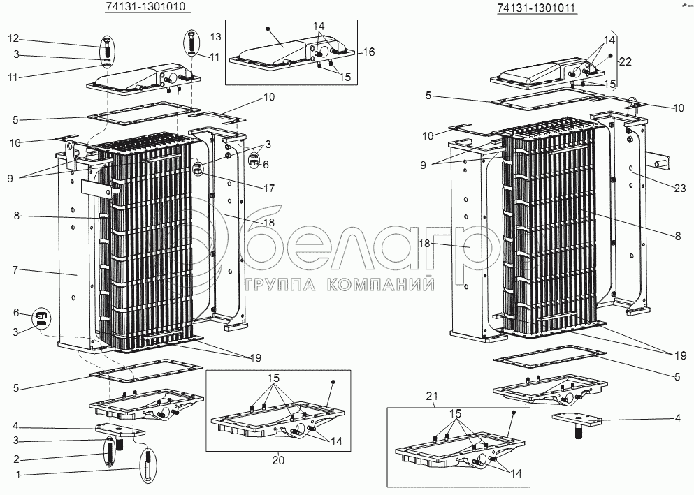 Каталог запасных частей к технике: МЗКТ-74131. Радиатор 74131-1301010, 74131-1301011