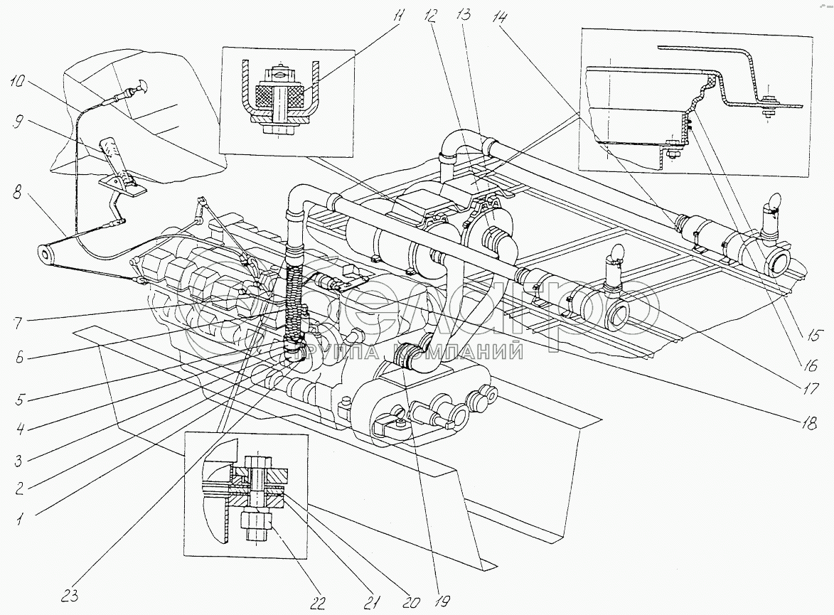 Каталог запасных частей к технике: МЗКТ-74131. Управление подачей топлива, трубы выхлопные
