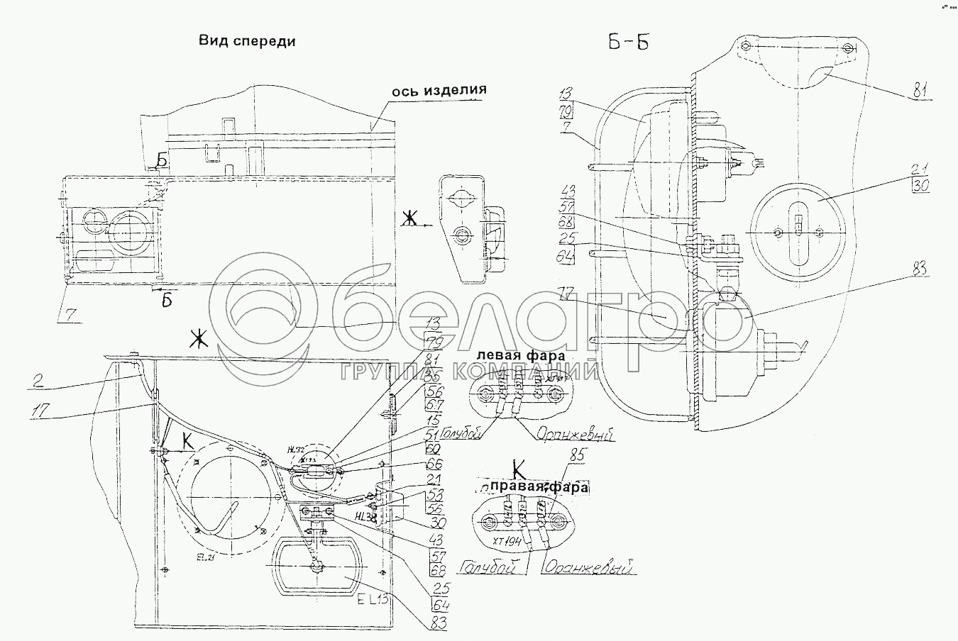 Каталог запасных частей к технике: МЗКТ-74131. Установка фар и передних фонарей