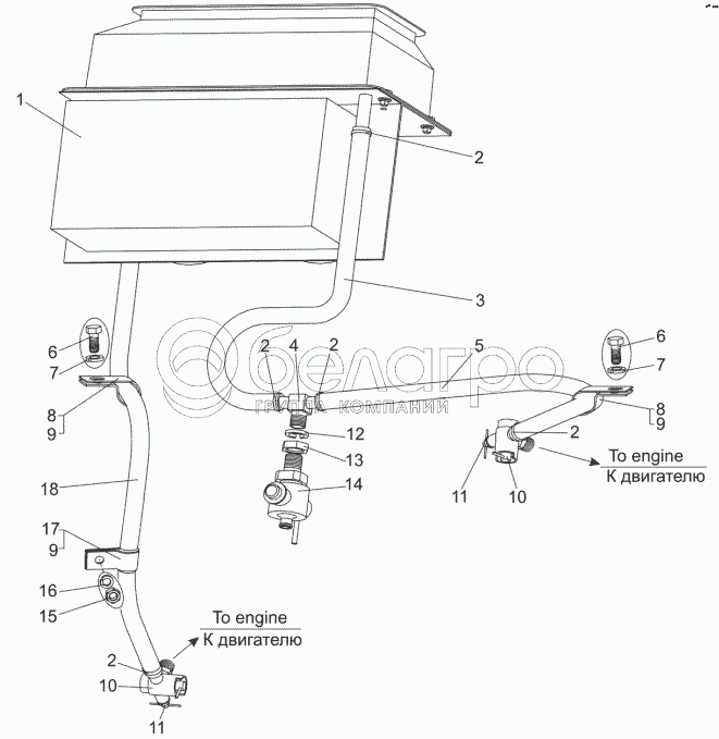 Каталог запасных частей к технике: МЗКТ-74131. Установка трубопроводов отопителя кабины