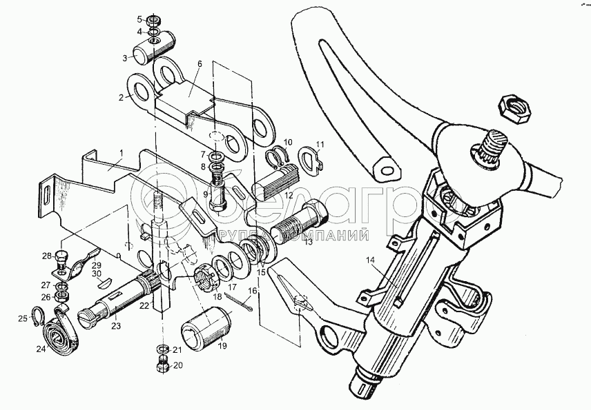 Каталог запасных частей к технике: МЗКТ-74171. Кронштейн с колонкой 64221-3403008