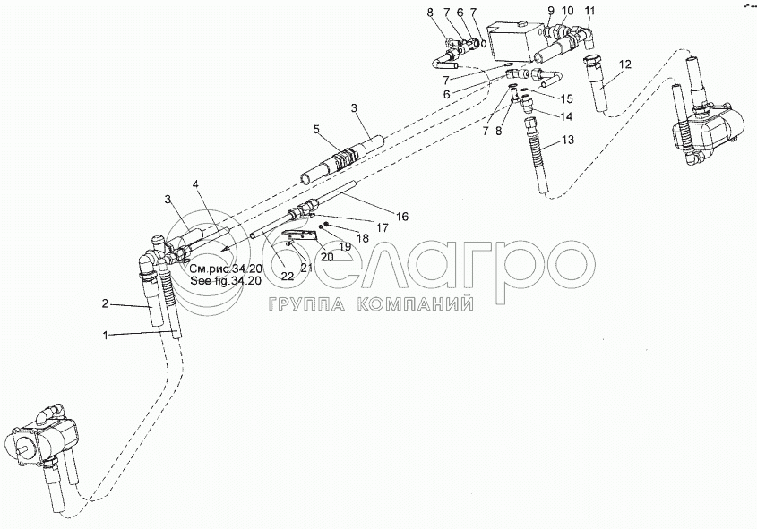 Каталог запасных частей к технике: МЗКТ-74171. Трубопроводы и шланги блока клапанов и насосов