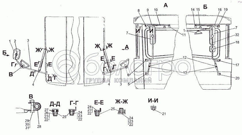 Каталог запасных частей к технике: МЗКТ-74296. Установка держателей зеркал и зеркал