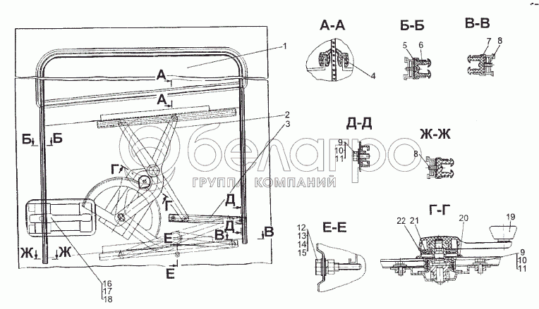 Каталог запасных частей к технике: МЗКТ-74296. Установка стеклоподъёмника задней двери
