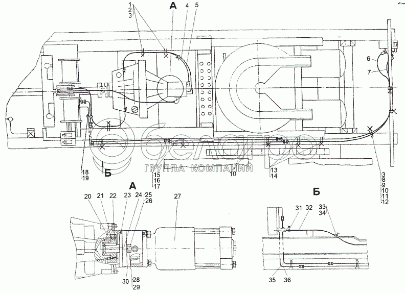 Каталог запасных частей к технике: МЗКТ-74296. Установка трубопроводов привода лебедки
