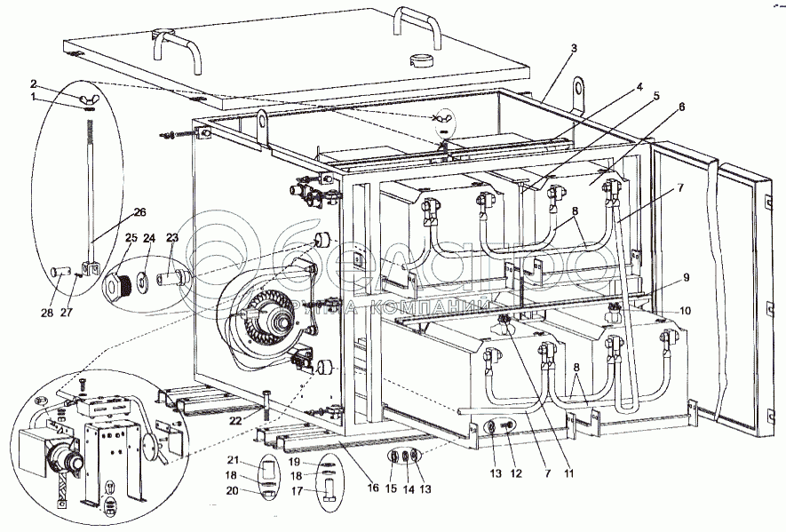 Каталог запасных частей к технике: МЗКТ-75165. Крепление контейнера и аккумуляторных батарей контейнера