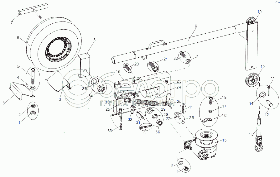 Каталог запасных частей к технике: МЗКТ-75165. Установка подъемника запасного колеса