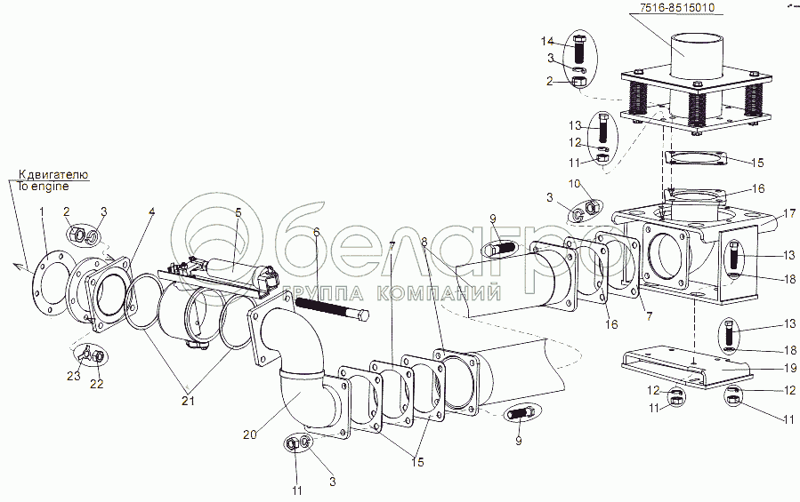Каталог запасных частей к технике: МЗКТ-75165. Установка системы выпуска отработавших газов