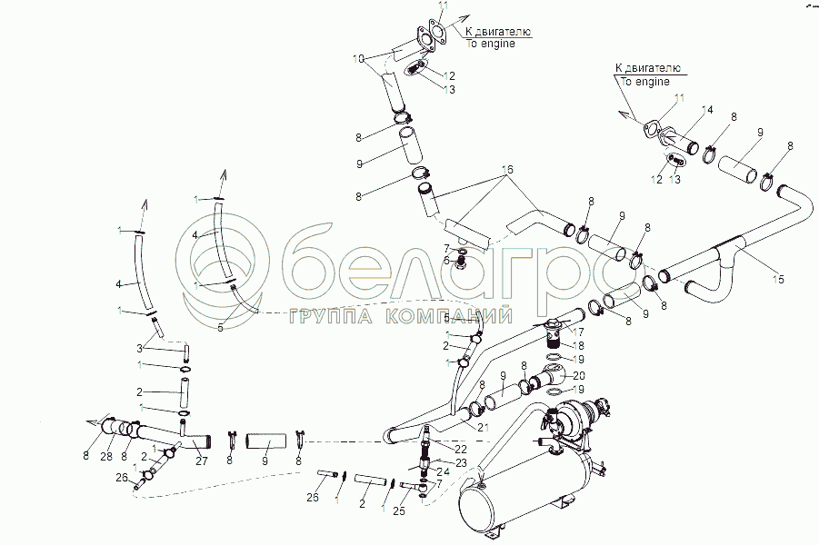 Каталог запасных частей к технике: МЗКТ-75165. Установка трубопроводов системы подогрева двигателя