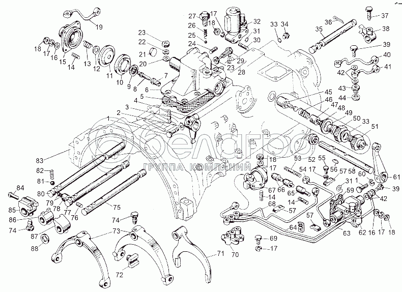Каталог запасных частей к технике: МЗКТ-79011. Механизм переключения передач и опора рычага