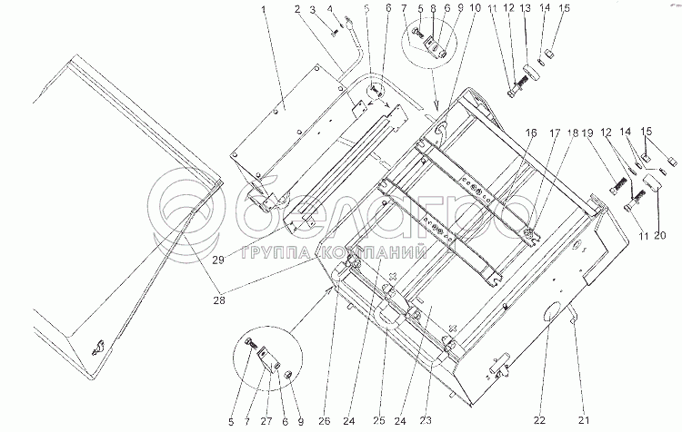 Каталог запасных частей к технике: МЗКТ-79011. Установка аккумуляторных батареи и контейнера