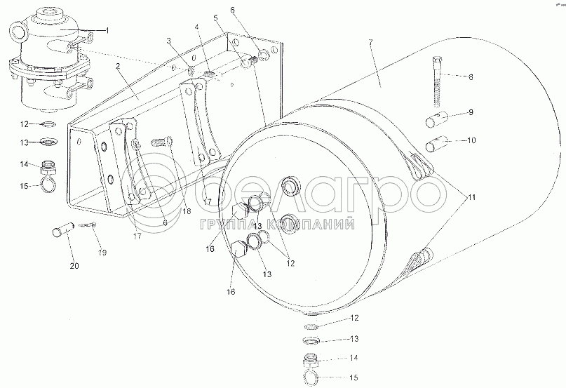 Каталог запасных частей к технике: МЗКТ-79011. Установка ресивера заднего контура и влагомаслоотделителя