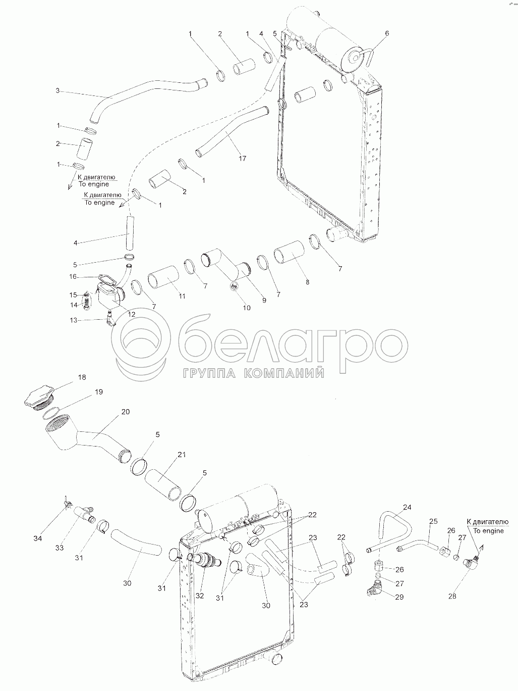 Каталог запасных частей к технике: МЗКТ-79011. Установка трубопроводов системы охлаждения двигателя
