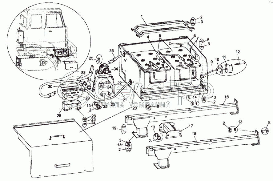 Каталог запасных частей к технике: МЗКТ-79091. Установка аккумуляторных батарей и контейнера