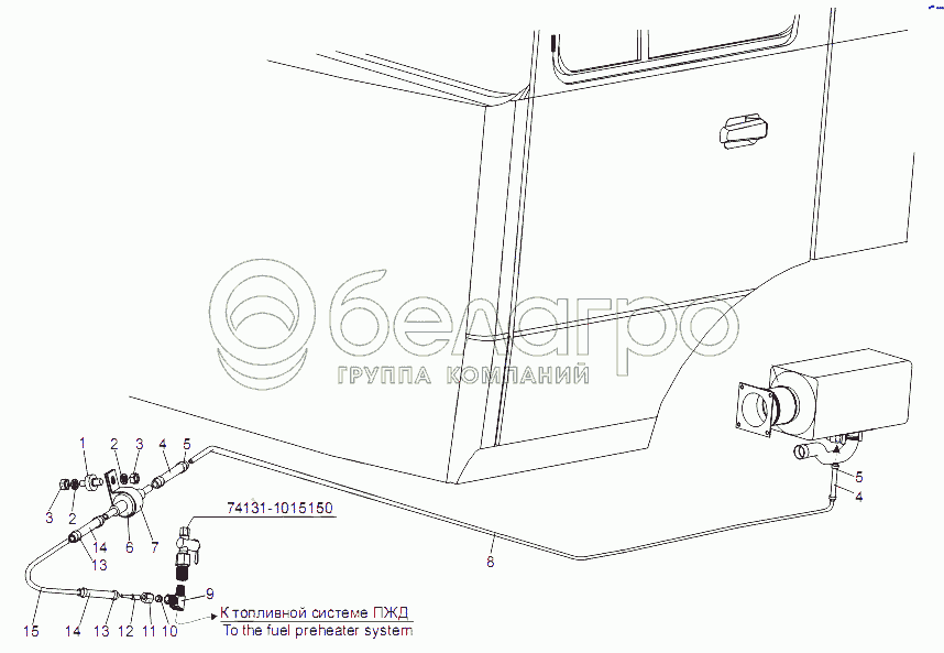Каталог запасных частей к технике: МЗКТ-79091. Установка топливопроводов независимого отопителя