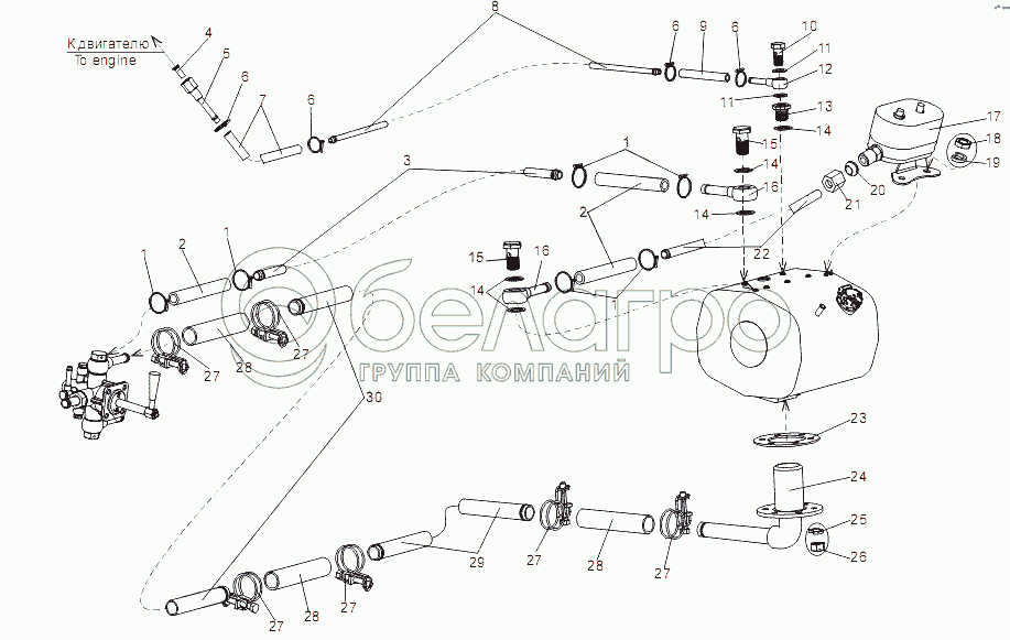 Каталог запасных частей к технике: МЗКТ-79097. Топливопроводы левого топливного бака