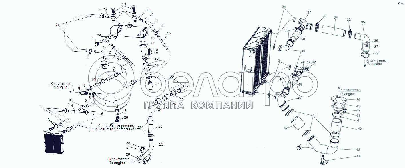 Каталог запасных частей к технике: МЗКТ-79097. Установка трубопроводов системы охлаждения двигателя