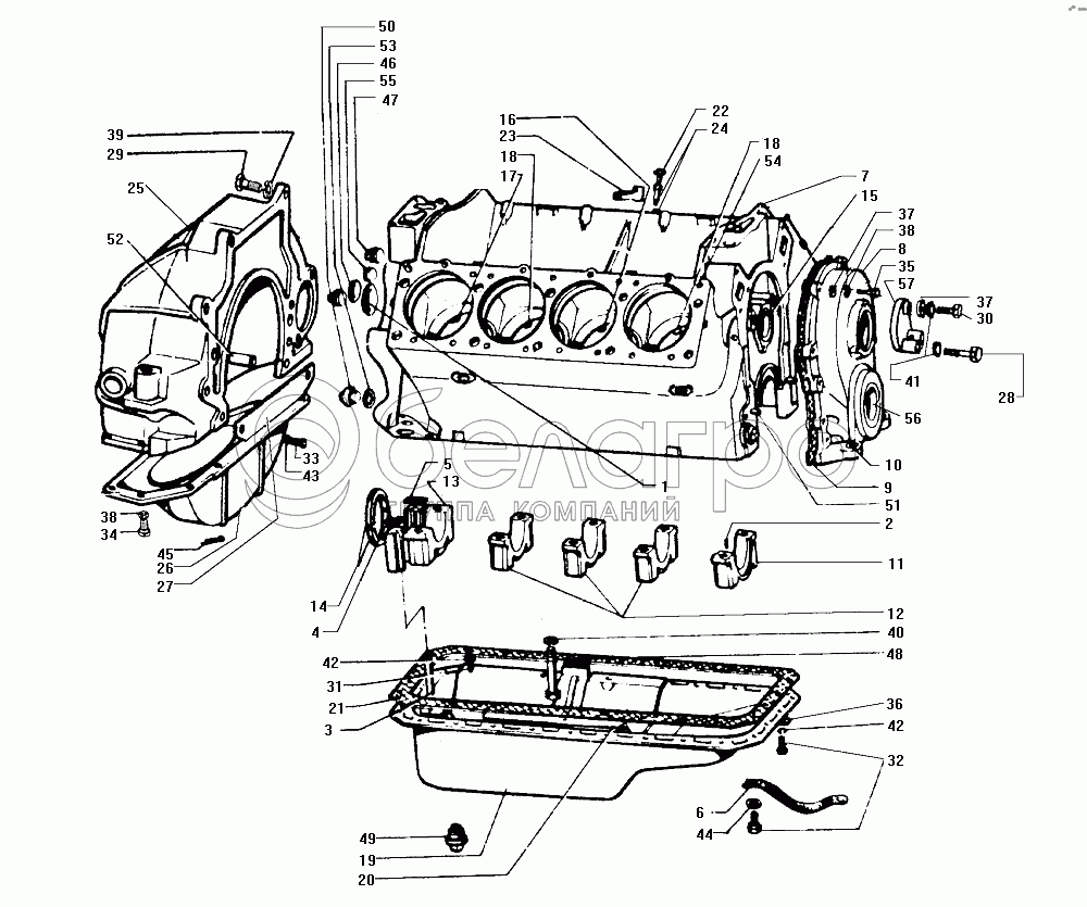 Блок цилиндров с крышками коренных подшипников и втулками в сборе