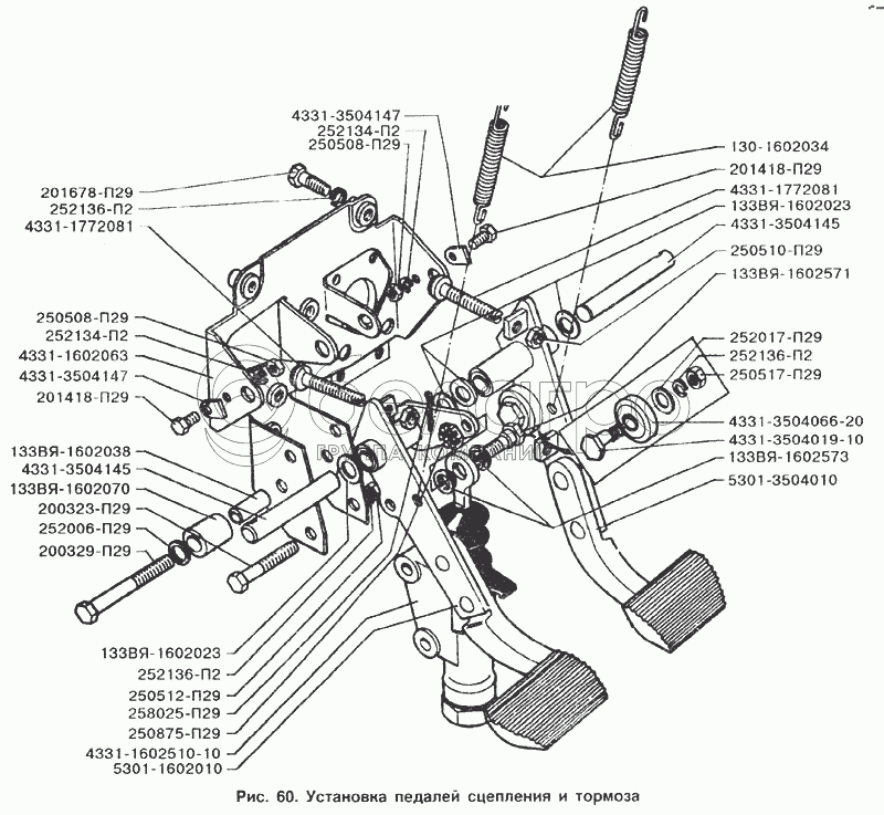 Каталог запасных частей к технике: ЗИЛ-133Г40. Установка педалей сцепления и тормоза