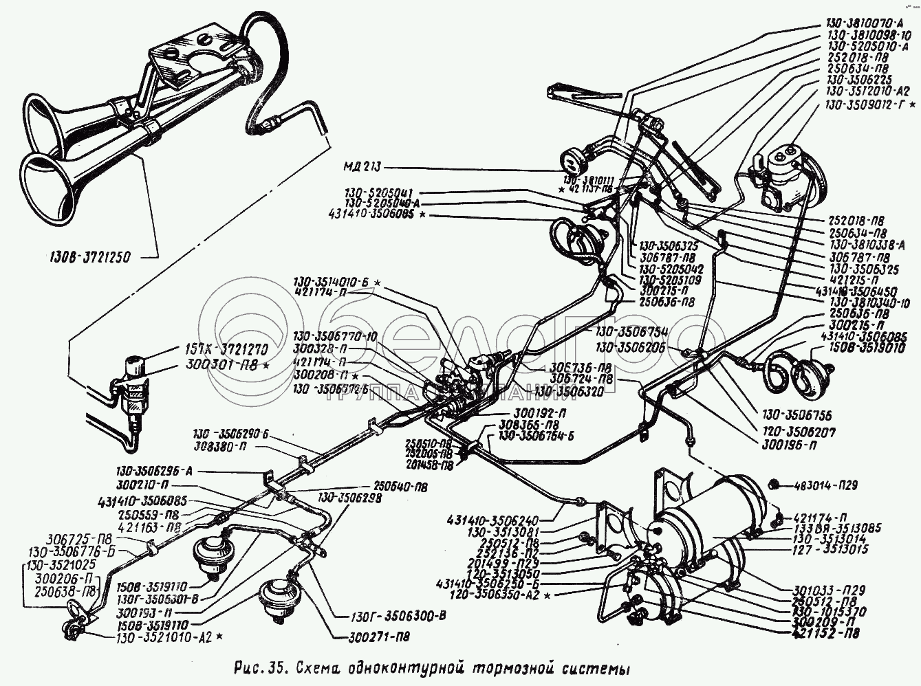 Каталог запасных частей к технике: ЗИЛ-431410 (130). Схема одноконтурной тормозной системы