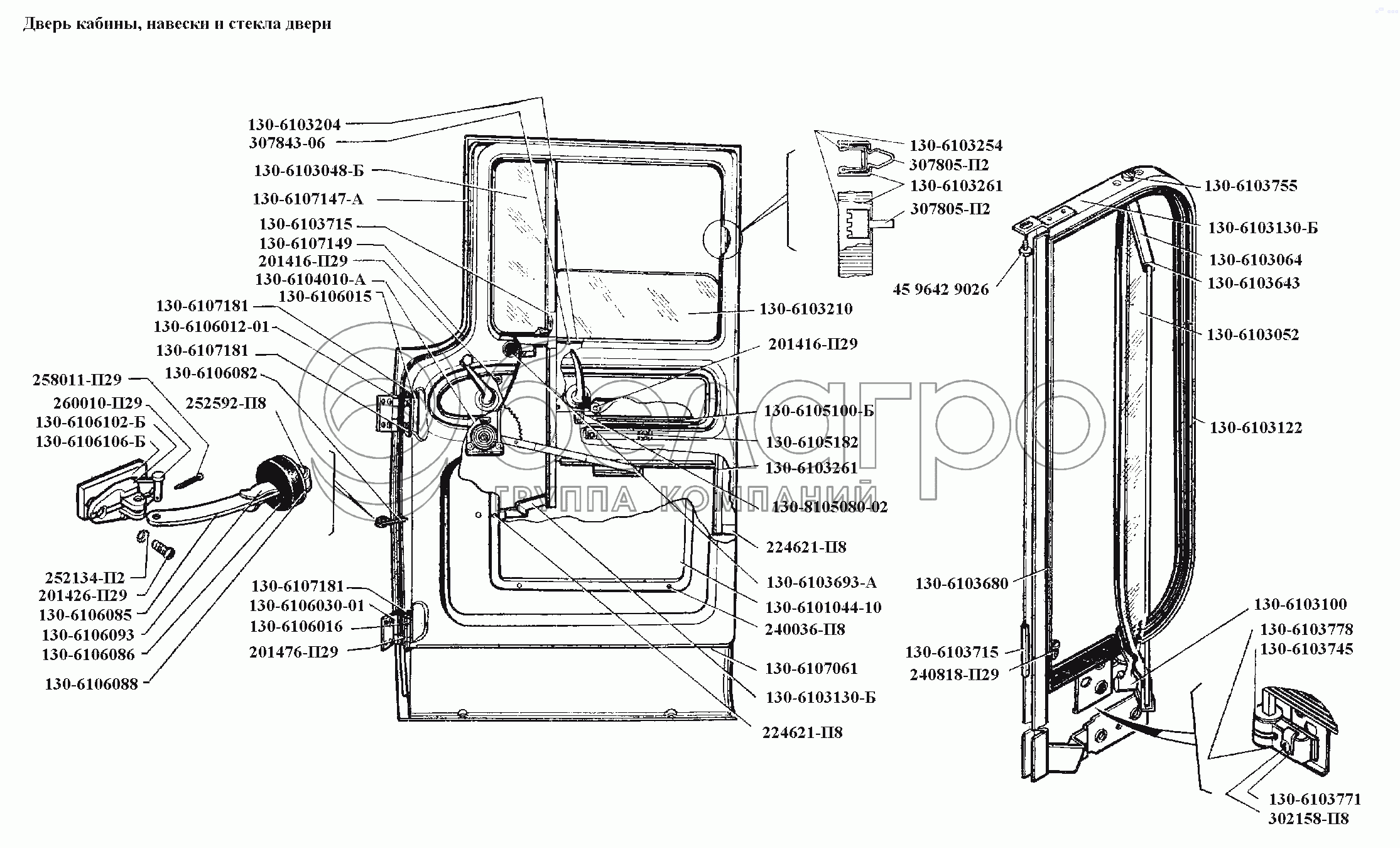 Каталог запасных частей к технике: ЗИЛ-431416. Двери\Дверь кабины, навески и стекла двери