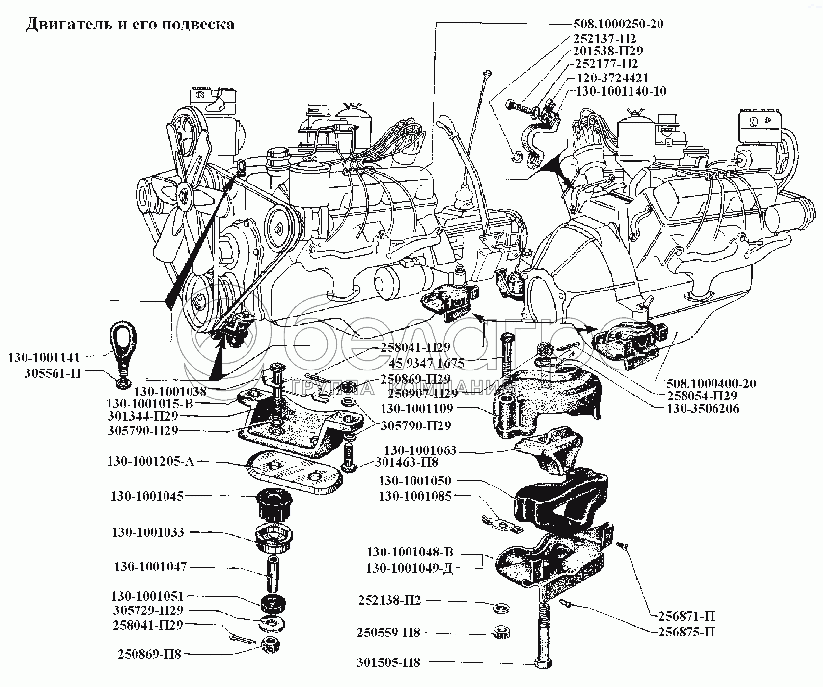 Каталог запасных частей к технике: ЗИЛ-431416. Двигатель\Двигатель и его подвеска