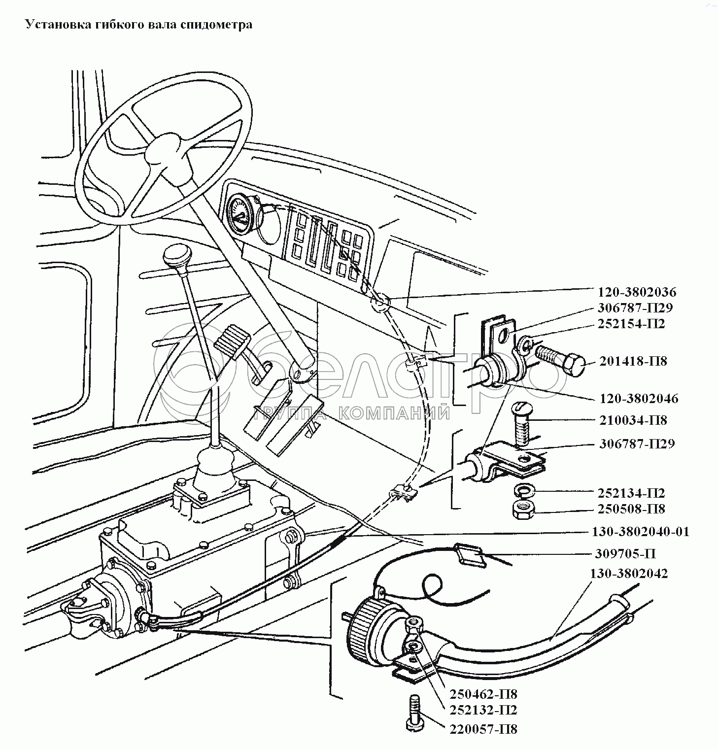 Каталог запасных частей к технике: ЗИЛ-431416. Приборы\Установка гибкого вала спидометра