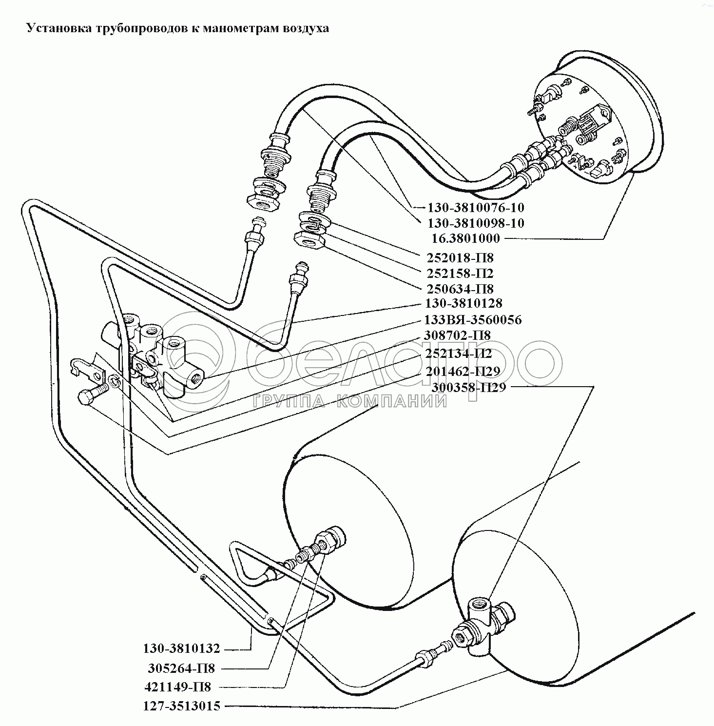 Каталог запасных частей к технике: ЗИЛ-431416. Приборы\Установка трубопроводов к манометрам воздуха