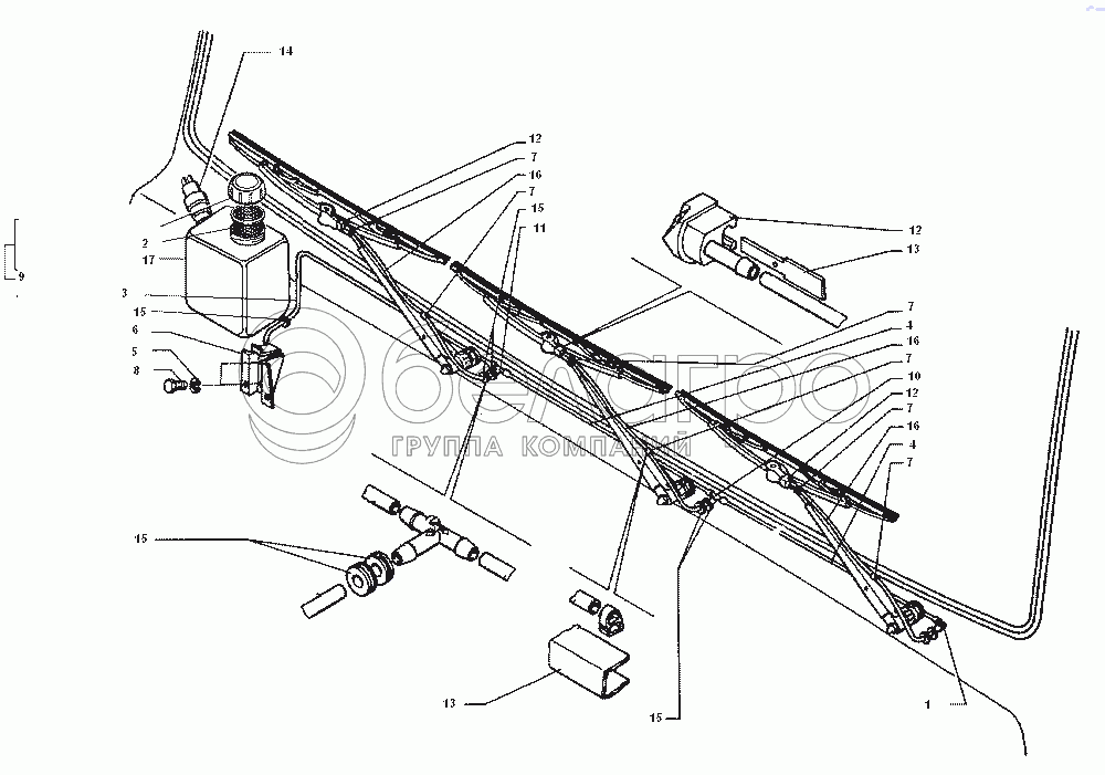 Каталог запасных частей к технике: ЗИЛ-43272Н, 43273Н. Установка обмыва ветрового стекла