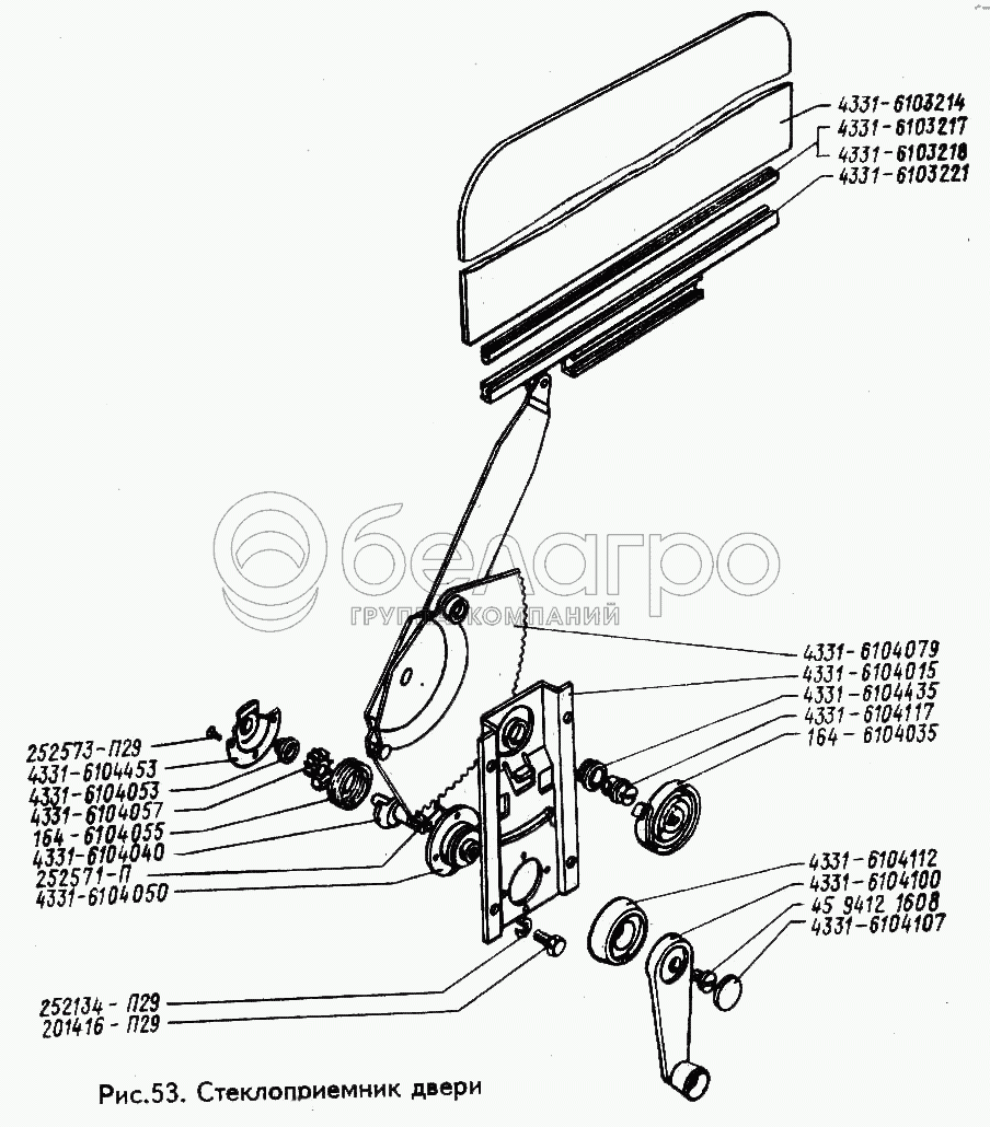Каталог запасных частей к технике: ЗИЛ-433100. Стеклоприемник двери