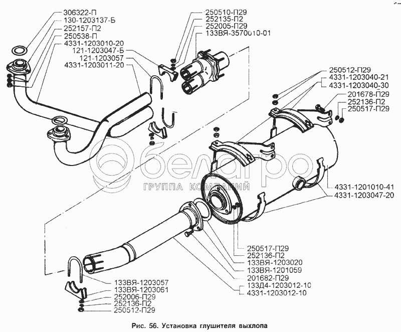 Каталог запасных частей к технике: ЗИЛ-433100. Установка глушителя выхлопа