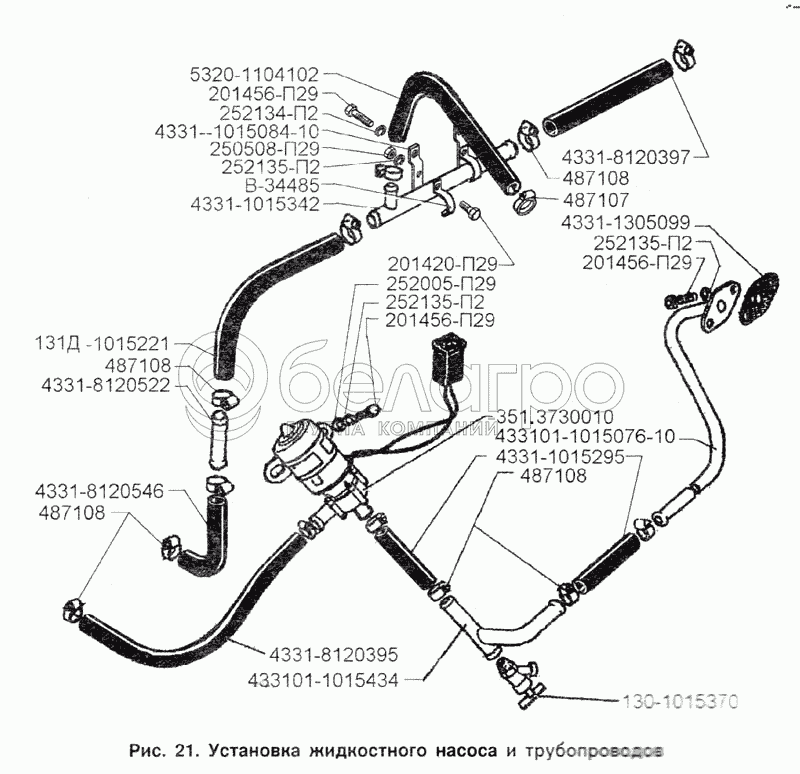 Каталог запасных частей к технике: ЗИЛ-433100. Установка жидкостного насоса и трубопроводов