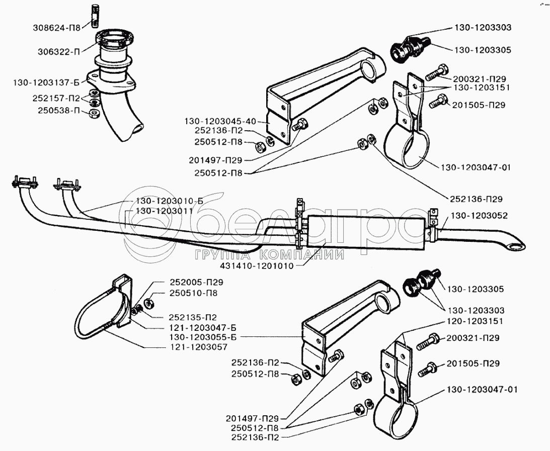 Каталог запасных частей к технике: ЗИЛ-433110. Установка глушителя, впускных и выпускных труб
