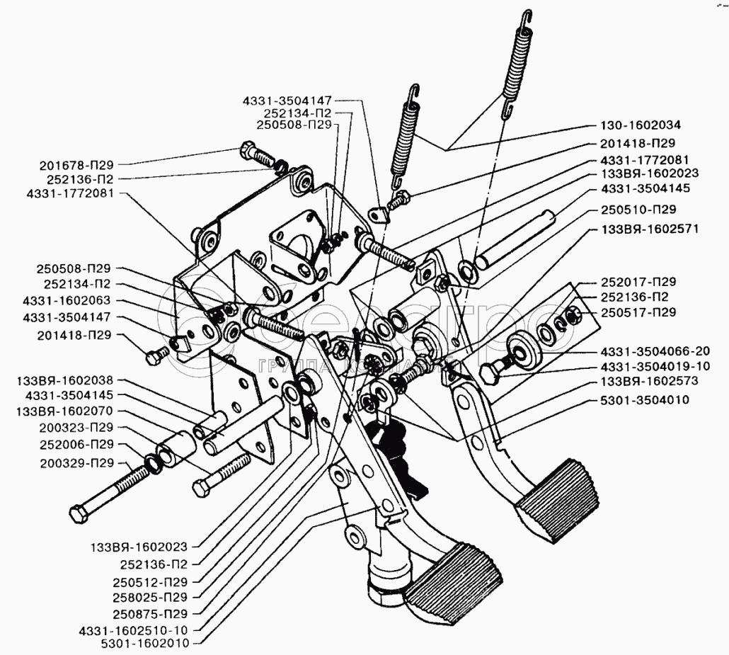 Каталог запасных частей к технике: ЗИЛ-433110. Установка педалей сцепления и тормоза