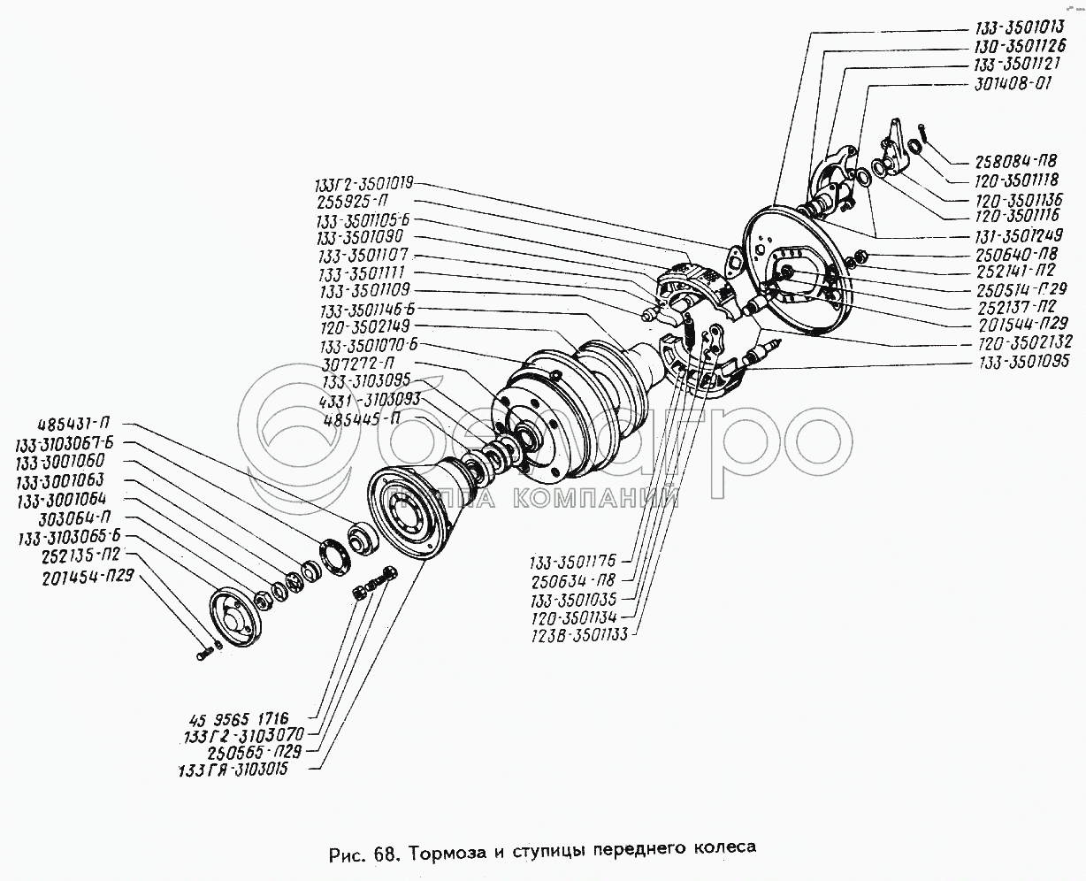 Каталог запасных частей к технике: ЗИЛ-494560. Тормоза и ступицы переднего колеса