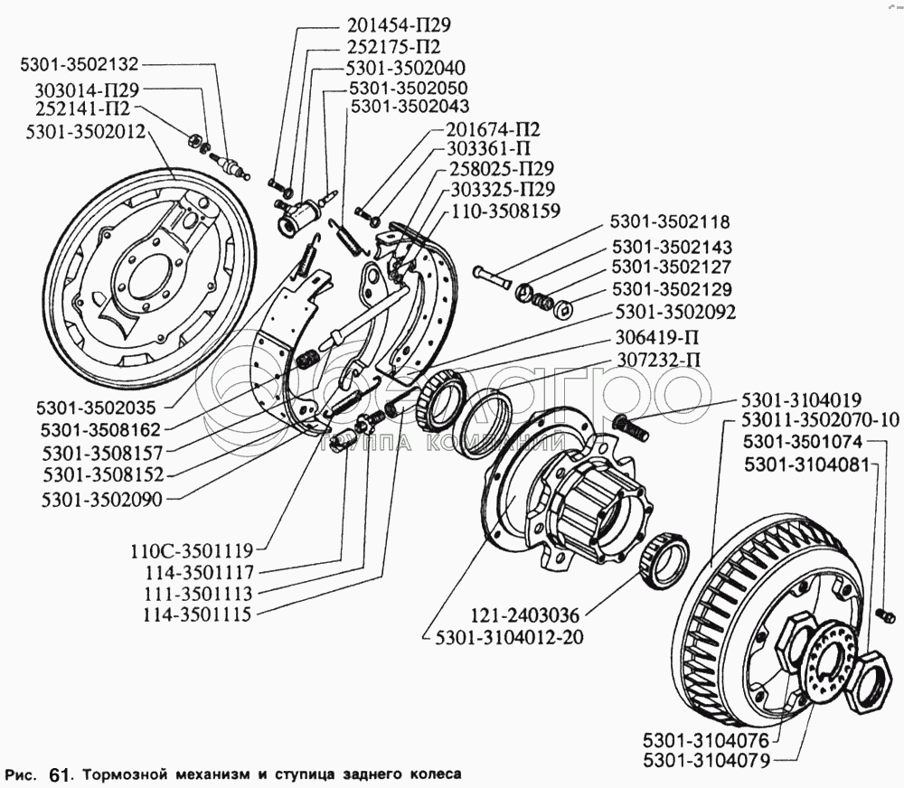 Каталог запасных частей к технике: ЗИЛ-5301. Тормозной механизм и ступица заднего колеса