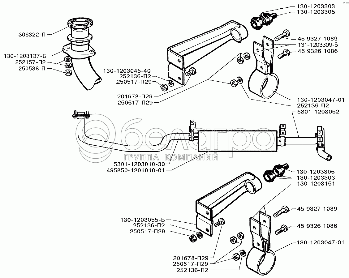 Каталог запасных частей к технике: ЗИЛ-5301 (2006). Установка системы выпуска отработавших газов