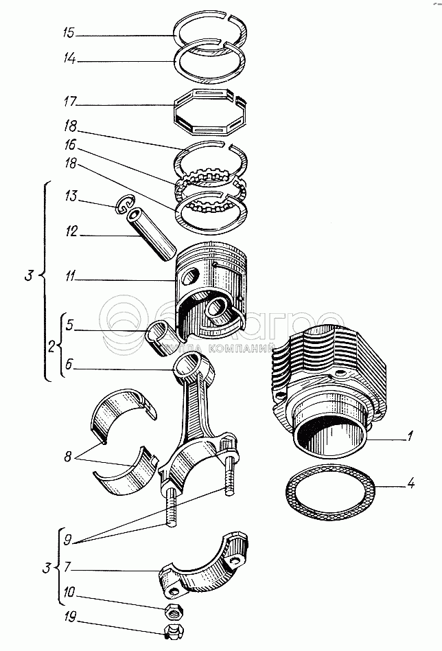 Каталог запасных частей к технике: ХТЗ Т-012. Цилиндр, поршень и шатун