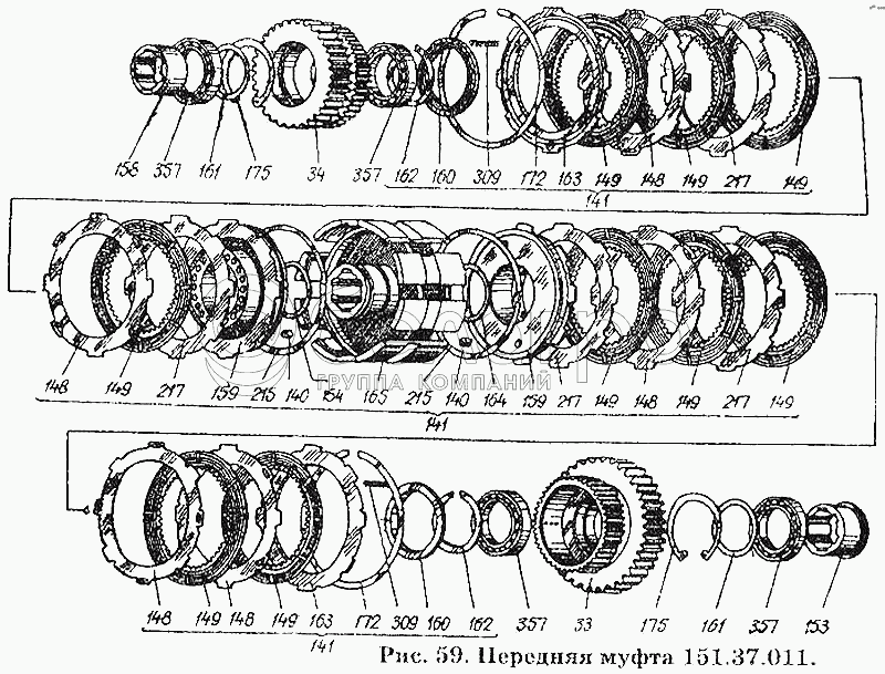 Каталог запасных частей к технике: ХТЗ Т-150К. Передняя муфта 151.37.011