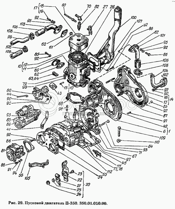Каталог запасных частей к технике: ХТЗ Т-150К. Пусковой двигатель П-350. 350.01.010.00