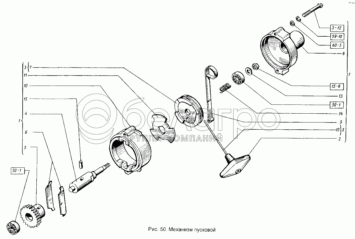 Каталог запасных частей к технике: ХТЗ Т-151К-08. Пусковой двигатель. Механизм пусковой