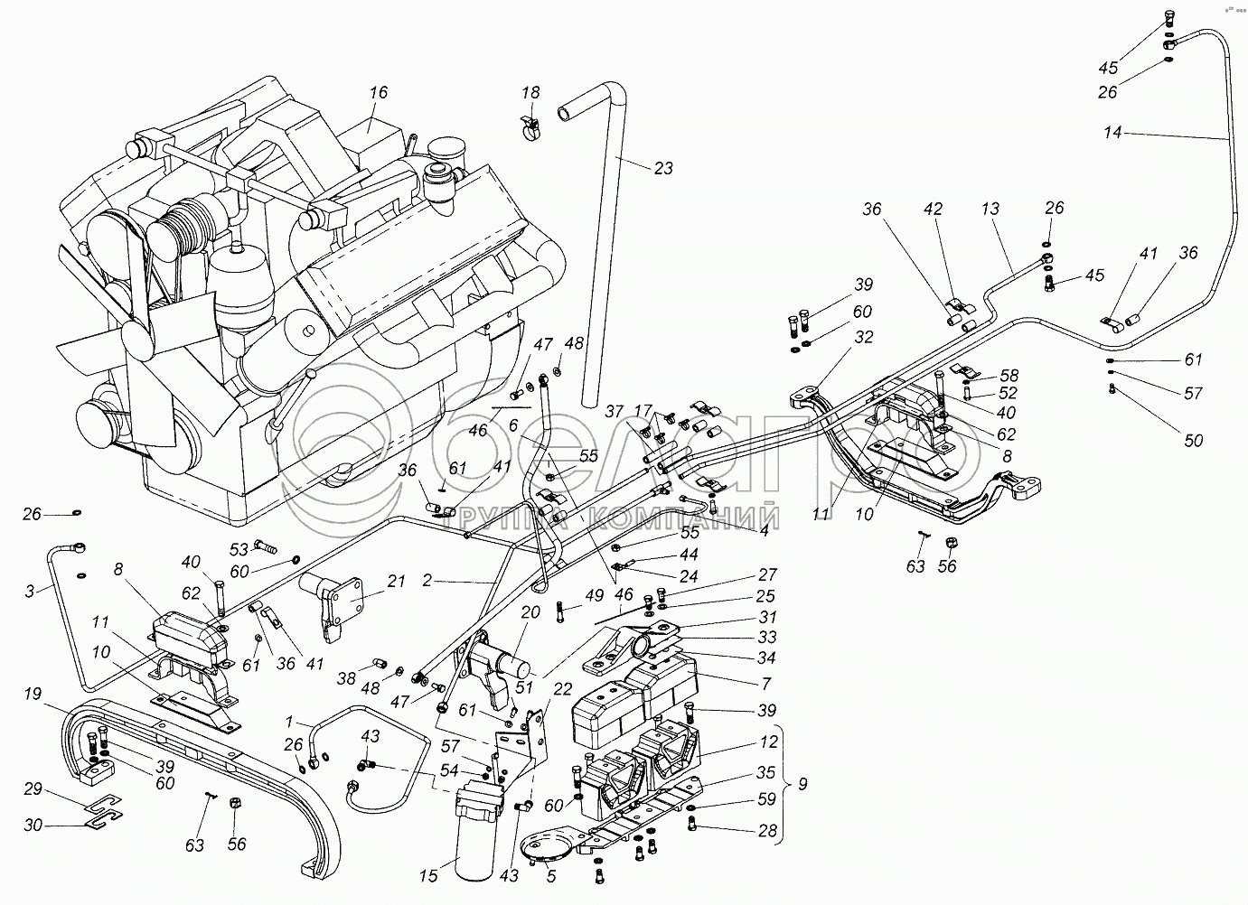Каталог запасных частей к технике: ХТЗ Т-151К. Установка двигателя