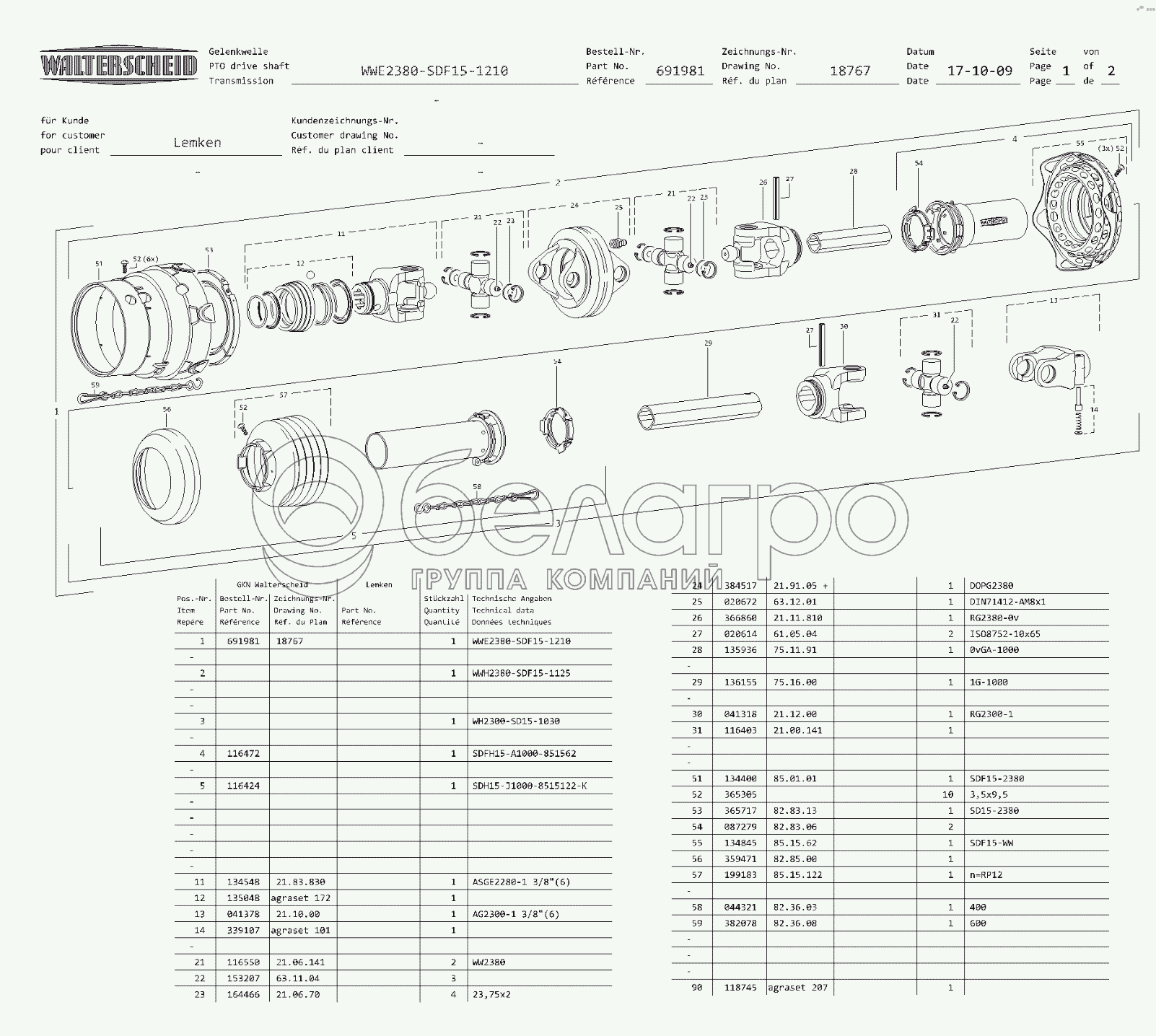 Каталог запасных частей к технике: Lemken Primus 10 (Часть 1). R001127 Cardan shaft