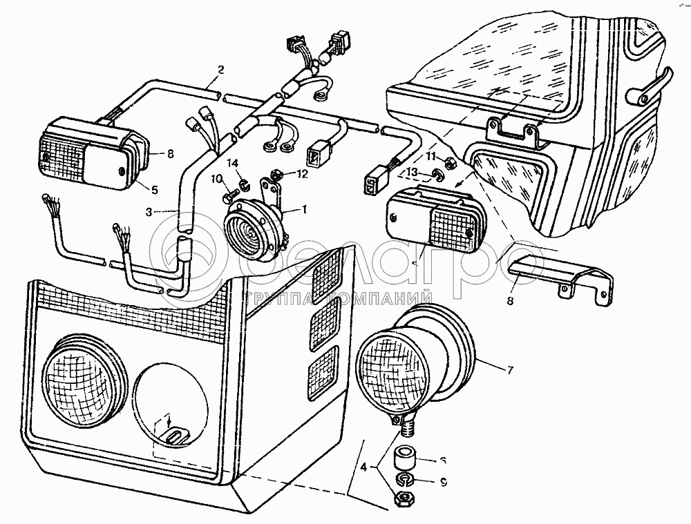 Каталог запасных частей к технике: ЛТЗ-55. Установка передних фар и фонарей