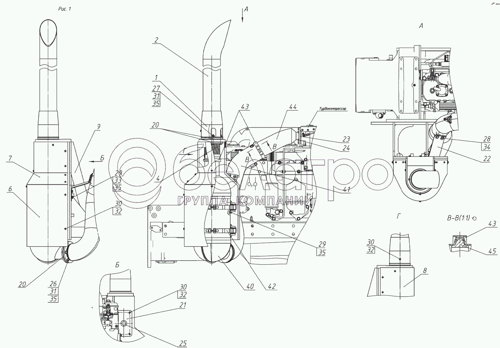 Каталог запасных частей к технике: МТЗ 1523.5. Установка глушителя