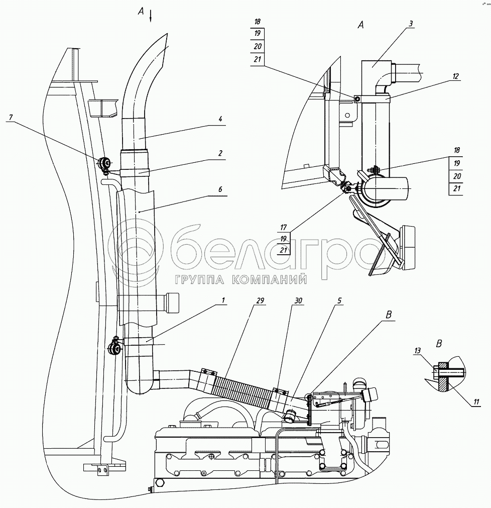 Каталог запасных частей к технике: МТЗ 2122.3/2122.4. Установка глушителя