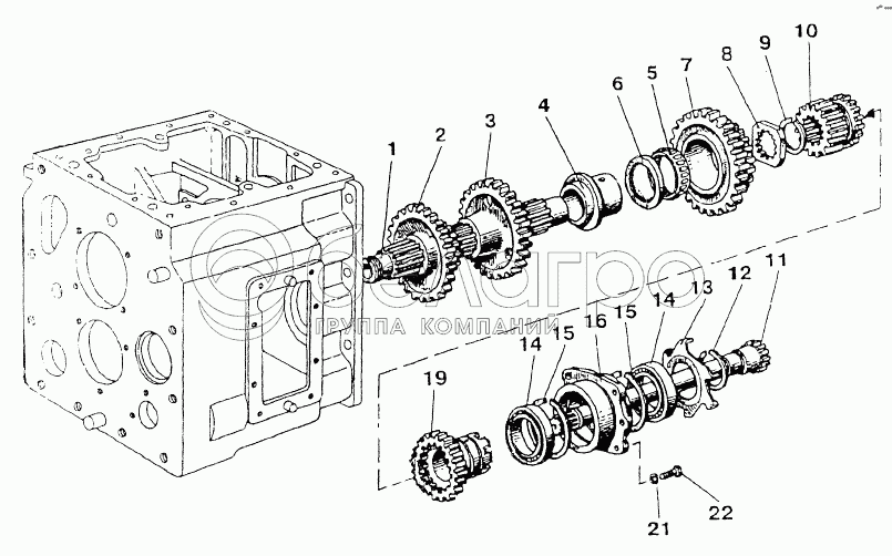 Вал 1-й передачи и заднего хода. Опора валов (900, 920, 950, 952)