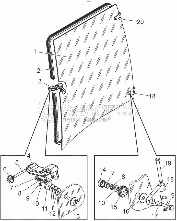 Каталог запасных частей к технике: МТЗ БЕЛАРУС 2103. Стекло боковое левое. Фиксатор левый